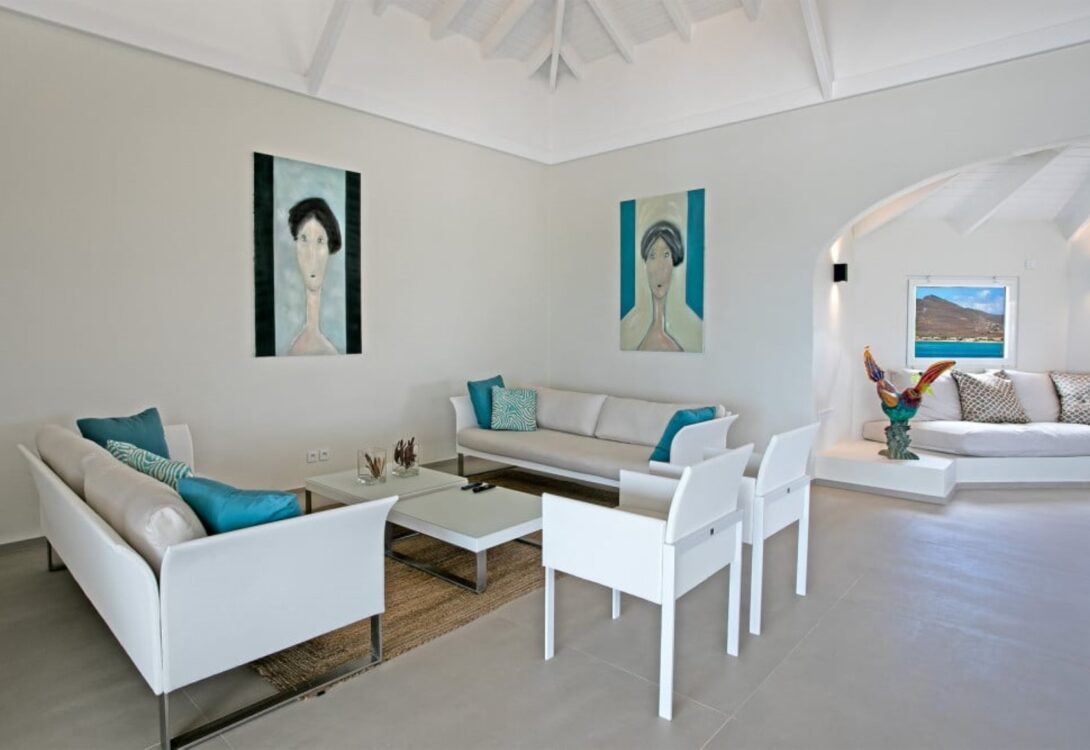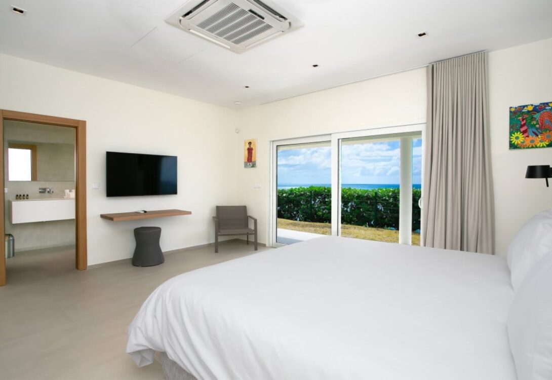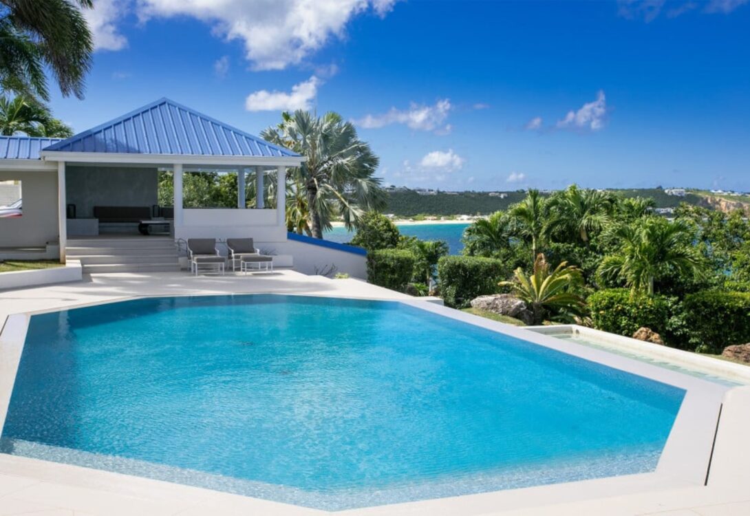 Outdoor living is a defining feature of Clifftop Oceanfront Villa. An oversized infinity-style swimming pool overlooks the ocean and Baie Rouge Beach, surrounded by sun loungers and generous terraces. A covered terrace and a gazebo with wet bar provide ideal spaces for alfresco dining, sunset cocktails, and relaxed gatherings. A landscaped garden path leads to a dramatic clifftop gazebo, offering spectacular views over the sea and the natural landmark known as “David’s Hole.”