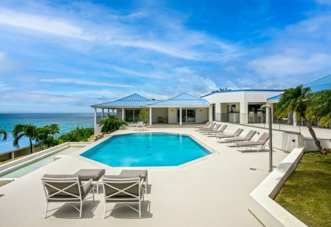 Dramatically positioned on a clifftop in Saint Martin, Clifftop Oceanfront Villa is an exceptional Mediterranean-style villa offering breathtaking panoramic views over the turquoise ocean and the pristine sands of Baie Rouge Beach. This elegant five-bedroom estate blends refined architecture with a relaxed Caribbean ambiance, creating an unforgettable luxury retreat.
